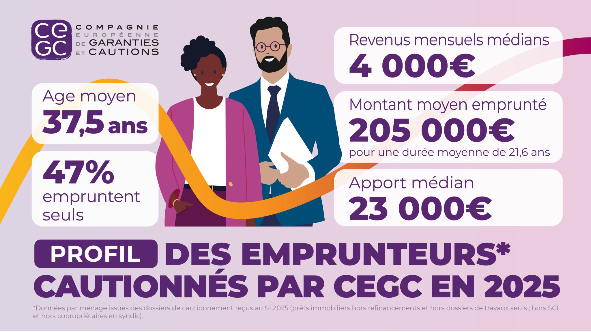 Infographie du profil type de l’emprunteur chez CEGC : l’âge moyen est de 37,5 ans et 47 % des clients empruntent seuls, avec un revenu mensuel médian de 4 000 €. Les clients empruntent en moyenne 205 000 €, avec un apport médian de 23 000 €.
